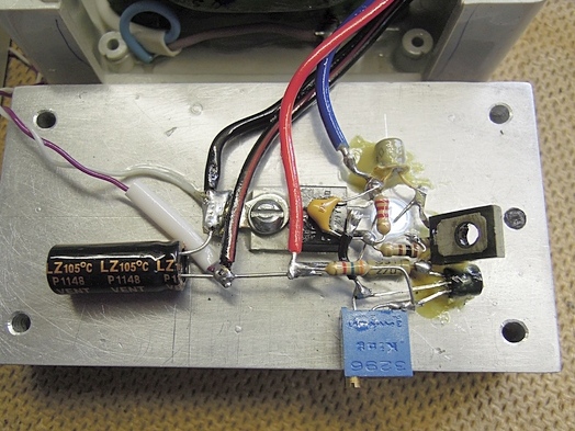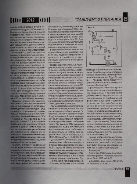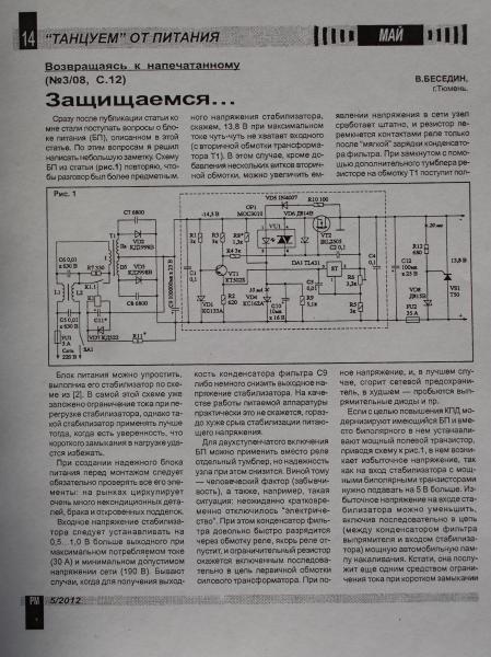 download/file.php?id=1092&mode=view Что было изменено : Убрана регулировка выходного напряжения,т.к.потенциометр- ненадёжная деталь,и всегда есть соблазн "что-то покрутить",а блок питает серьёзную,дорогую аппаратуру,надёжность-на первом месте... Транзистор КП303Г снижает пульсации 100 Гц на выходе с 80 до одного милливольта. МП26 применён не по жадности,просто его рабочая частота не более 0,5 МГц,что хорошо сказывается на устойчивости схемы. Ещё рекомендации : С1 выбирают из расчёта 3000 Мкф / на ампер потребления(эмпирическая формула) ,С2- прямо на выходных клеммах, снимает остаточный шум стабилизатора. Диоды Шоттки SBL3040PT в мосте позволяют выходной ток хоть до 50А (шунтировать конденсаторами 0,1 Мкф, и параллелить диоды в сборке,монтировать с прокладками,на радиатор при токах более 10А. Большое достоинство схемы- питание от трансформатора на 12,6 вольта,т.е. после моста -на С1 всего 16 вольт ! На токах 20 и более ампер-надо уже делать "мягкий пуск" - т.е просто ставить китайское реле на 12 в DC на выход- а контакты его должны перемыкать резистор последовательно первичке (20-50 ом) Иначе любые диоды сгорят. Предохранитель- ПР1- на рабочий ток. Силовой транзистор - IRL1404 ,при токах более 25А- приходится монтировать на медную пластину, а уж её на Al радиатор (всё с пастой КТП-8) Если мало напряжение-просто один из стабилитронов замените на КС168- будет 13,8 вольта. Схему в Кирове повторяли минимум 3 человека,каждый по своему ,но авторский вариант. (именно на 25А) Даже при аварии -напряжение на выходе- безопасно для практически любой р/любительской техники. Схему "обдува" применяю вот эту :