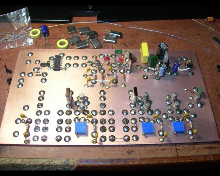 Не хватает времени на самоделки,работа...Но все же медленными,уверенными темпами двигаемся в сторону вседиапазонного CW аппарата.На фото часть тракта ПЧ с диф.-мостовыми фильтрами на полосу 600Гц и 250Гц.Работы еще прилично... Изображение
