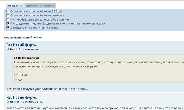 Toni посмотри почито не идут мне сообщения из тем , галки стоят , а то приходится заходить и лопатить темы , теряя время , на старом форуме я мог месяцами не заходить , но видел все , что пишется на форуме