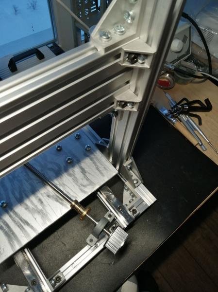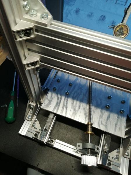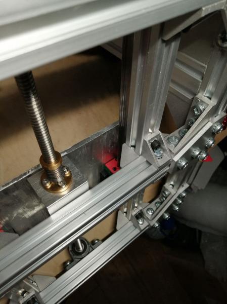 Все же заказал ШВП1204 и снял *принтерные* ходовые винты. Пойдут на проект лазерной выжигалки, не место им в ответственных узлах фрезера. Заодно добавил жесткости порталу, скрепив его со стойками дополнительными уголками