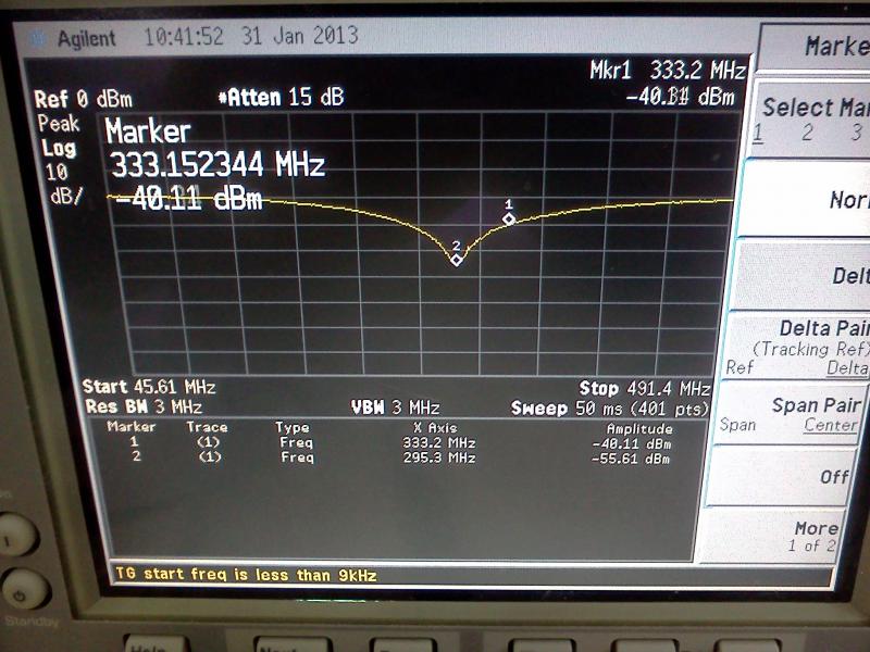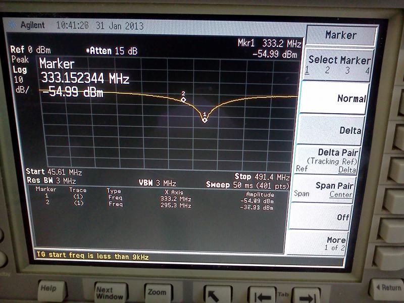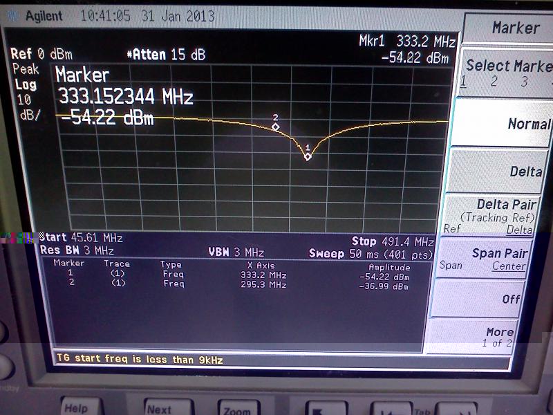 Уровень прямого участка -30 дБм, уровень подавления (маркер 1) -54 дБм, то есть сигнал в этой точке ослабляется на 24 дБм (кстати, при большей развёртке (или меньшей полосе измерения) более точно подавление намеряется около 30 дБм). Частота, примерно , 333 МГц.