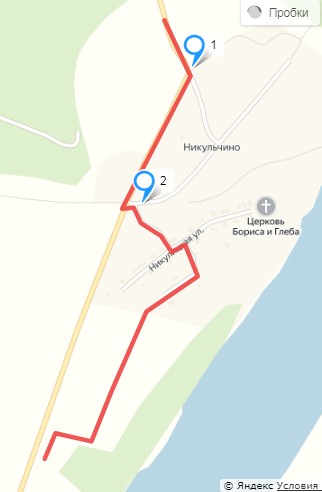 Едем по асфальту из Кирова через Порошино на Боровицу. Проезжаем Суворовы. Проезжаем мост через Никульчинку, впереди ресторан "Лесная сказка". У "Лесной сказки" развилка. Налево - асфальт на Боровицу-Баташи. Прямо - щебенка на Никульчино. По щебенке через километр поворот с просеки газопровода налево в лес на грунтовку (прямо стоит знак Движение запрещено). Дальше ехать по "самой широкой и накатанной" песчаной грунтовой дороге с несколькими развилками и одним крутым поворотом до второй (большой) газораспределительной станции, мусорных баков и указателя "Никульчино" (метка 1). На указателе есть информационный щит, у которого можно остановиться и ознакомиться с древней историей села.
