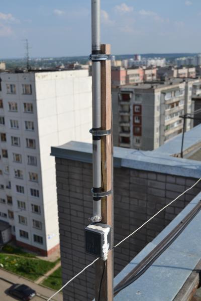 Для изготовления антенны были применены алюминиевые трубки по 2 метра, диаметром 20 и 18 мм. 18ти миллиметровую трубу можно обрезать до 1,2 м. С торца 20мм трубы делаются два пропила вдоль по 2 см и в неё вставляется 18мм трубка до получения общей длины 2,9 м. В месте пропила 18мм труба фиусируется в 20мм трубе автомобильным хомутом. Торец тонкой трубы (верхушка антенны) можно чем-нибудь заткнуть. Я заткнул роликом смотанным из ПВХ изоленты с герметиком. Дале трубку прикрепил к небольшой деревянной мачте, так же хомутами. Мачту прикрепил к ограждению крыши.
