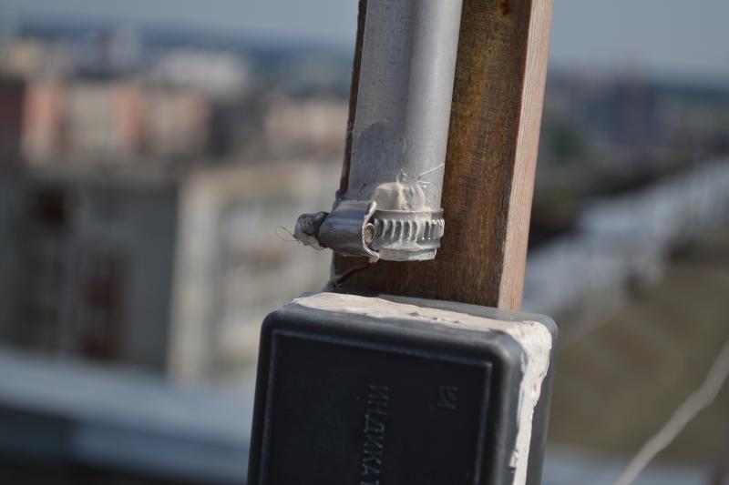 В месте контакта хомута и полотна антенны намотал на всякий случай изоленту. У основания расположил герметичную коробку (собственно герметичной коробка стала после хорошего слоя герметика