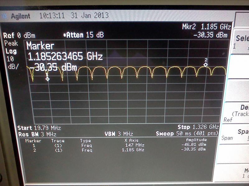 Уровень прямого участка -30 дБм, уровень подавления (маркер 1) -54 дБм, то есть сигнал в этой точке ослабляется на 24 дБм (кстати, при большей развёртке (или меньшей полосе измерения) более точно подавление намеряется около 30 дБм). Частота, примерно , 333 МГц.