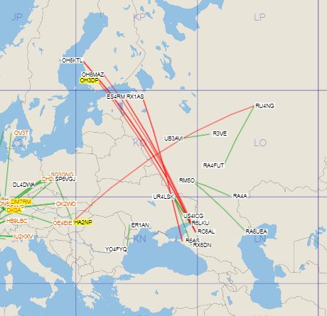 Сегодня, 21 -го июля порадовал нашу область спорадик снова....У меня комплектная связь довольно хорошая : RW9UI 144300.1 UA4NDX [AS] Asiatic Russia (2314Km) LO48TO<ES>NO33HU 59/58 13:28z Поговорили долго , минут 5 ,с замираниями, конечно, Владимир из Кемерово... Ещё он "подогнал" двоих из области своей в SSB - RA9UKW, RA9UIX, но они меня слабо принимали......Других областей Сибири нисколько не слышал, только эту... Картинка связей была загляденье ! Видео не успел, конечно записать...Но карта есть на это время-
