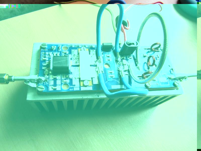 Сегодня провел первые испытания. Хоть усилитель и широкополосный, но резонанс все таки есть. Оказался он на 158 МГц, это говорит что не угадал с длинами кабеля, нужно укорачивать. При выставленном токе покоя 0.5 А,24В входной мощности 2Вт имеем 145 МГц-58Вт, 158 МГц-67Вт. При 27В и том же токе покоя имеем 145МГц-72Вт, 158МГц-80ВТ. Ну что же осталось подобрать длины кабелей, настроить вход. В общем самая кропотливая и нудная работа по доводке каскада до своего логического завершения.