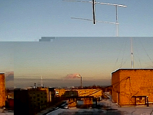 For R4NX . Олег ,мои поздравления с новым местом ! Между нашими штырями 88 метров , вот пара фоток с моей телекамеры(слева от трубы Биохима видно), и просто фотиком с балкона (F=200mm объектив при пересчёте на 24х36 фотокадр) При одном диапазоне- отстроившись на 50-100 кГц - не замечаю твою работу, при смежных - вообще не слышу. 73! Успешно достроить!
