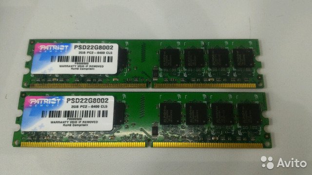 2 планки по 2 Гигабайта DDR2 Patriot 800MHz. Хочу за комплект 1000р.
