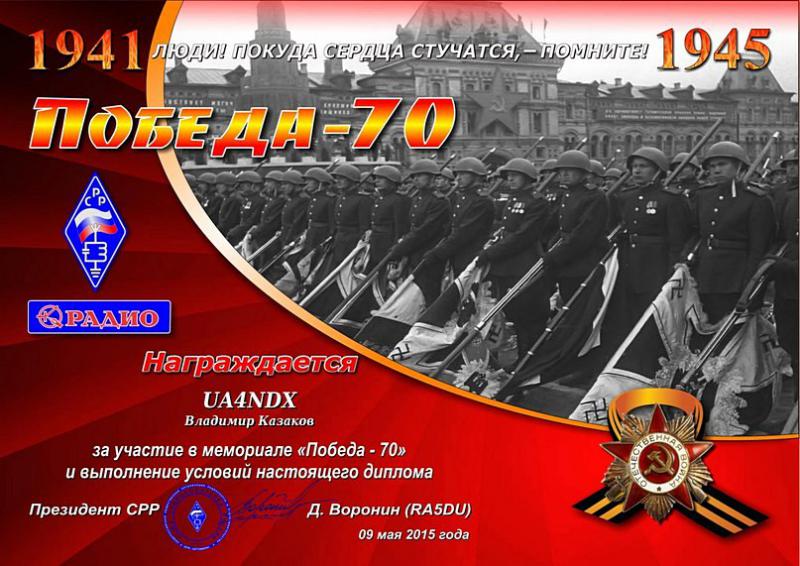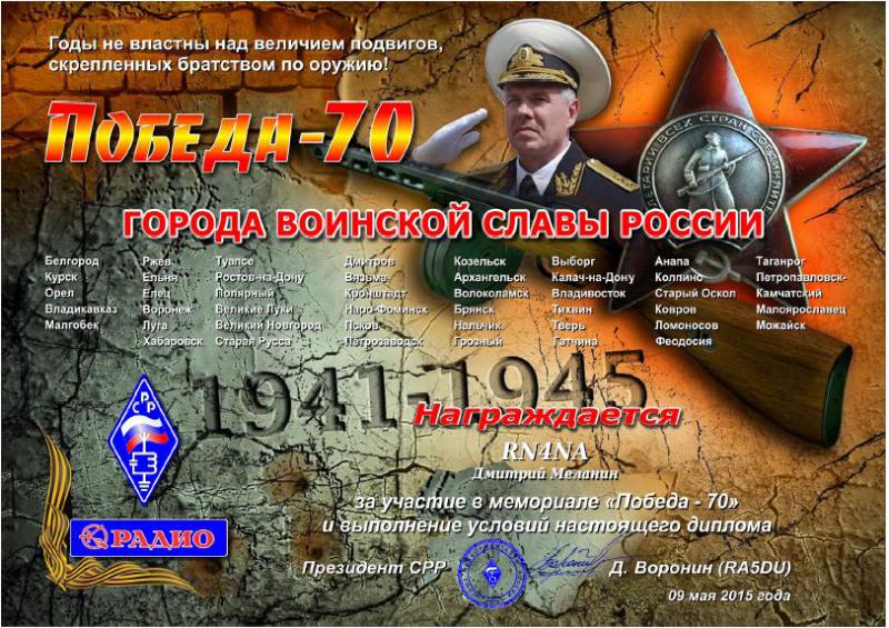 Диплом "Победа-70" сделан за 2 вечера, SSB . Реально выполнить на одном диапазоне, 40м. (телеграфом-легче,нет там "киловаттников" ) Гораздо труднее выполнить "города-герои".....
