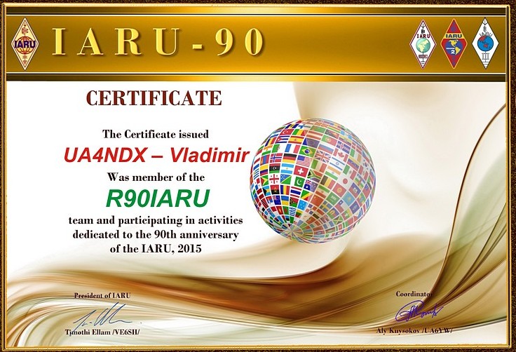 В честь празднования 90-летия Международного Союза Радиолюбителей (IARU), основанного в 1925 году, IARU выдаёт красивый диплом радиолюбителям, установившим связи с юбилейными станциями 10 стран, членов IARU, в период с 1 января по 31 декабря 2015 г.