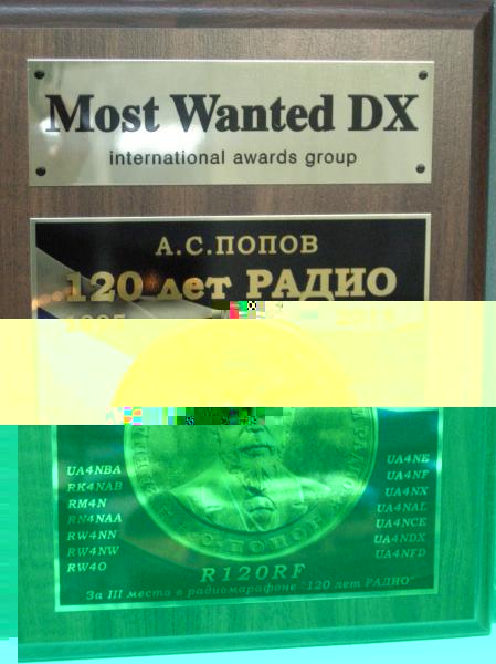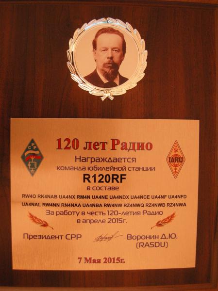За нашу отличную работу спецпозывным R120RF пришла доска "120 лет Радио".