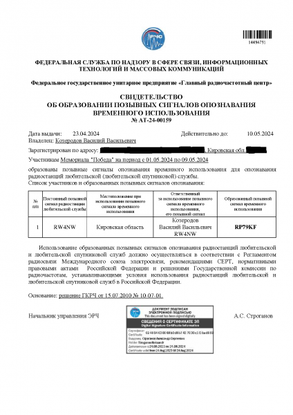 Сегодня, 11 апреля 2023 года, свидетельство об образовании позывного сигнала временного использования RP78KF для участия в Мемориале ПОБЕДА-78 на период с 01.05.2023 по 09.05.2023 получено.