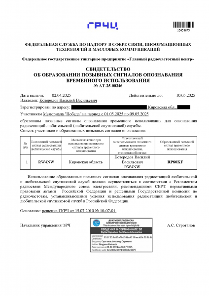 Свидетельство об образовании позывного сигнала временного использования RP80KF для участия в Мемориале ПОБЕДА-80 на период с 01.05.2025 по 09.05.2025 получено.
