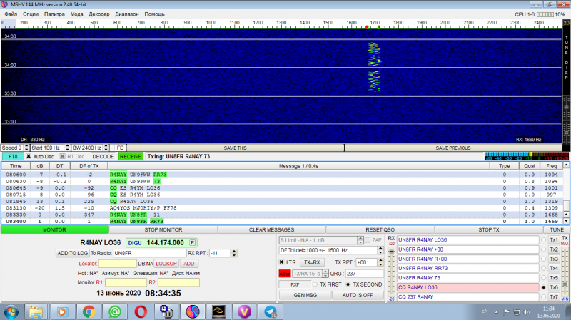 Пока облако тусовалось поблизости , в цифре неоднократно принимал RA9XI LP51, притом Яги была развёрнута от него на 180 гр, предположил , что его сигнал отражался обратно от ближнего облака, или же у оператора была хорошая энергетика на выходе. Также были декоды от R5WM несколько раз. И очень много пингов , ну почти каждый период, как будто в метеорном потоке :-)