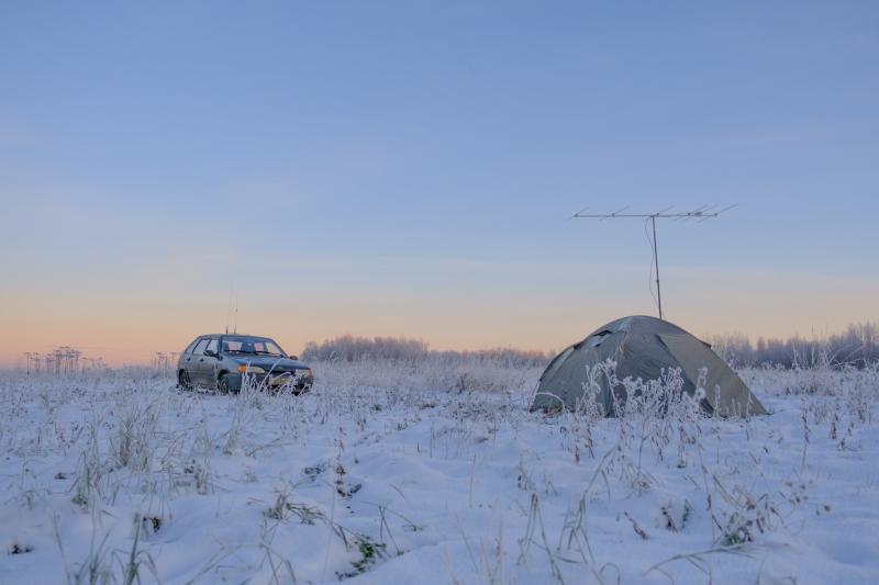Решил в этот раз во что бы то ни стало поуаствовать в контесте. Как обычно, из дома ловить нечего - надо ехать на гору. В прошлый раз выезжал на родину предков - С. Карино в Слободском районе. На высокой точке (207 м.) располагается местное кладбище, эту горку я знаю с детства. Мой дядя, живущий в Карино, сказал, что дальше есть горка повыше, и я принялся искать новую точку заброски. Помог мне в этом ресурс [url=https://ru-ru.topographic-map.com/maps/e4rs/Кировская-область/]https://ru-ru.topographic-map.com[/url], нашел там и саму точку (242 м.), и как к ней проехать. Выезжать пришлось затемно, в 4 (мск) утра, чтобы не торопясь доехать и встать лагерем на локации. В 6(мск) часов я на месте, расположился на поле близ точки. Высота составила 231 м, qth lo58eo. Пока ставил палатку, столик, станцию и мачту с антенной, начало светать. Что сказать: нежнейшие оттенки неба сложно передать на фото, но я попробую. Примерно 6:40 первые qso для настройки на азимуты, 0.5 ваттами легко открываются кировские репитеры. Сатеап такой: Yaesu FT-817, 6-эл. яги, Мачта - осветительная стойка 4м. Дистанция до Кирова примерно 42 км. С горы виден Слободской, мигает огоньками. Тишина, холодрыга! Как работал в контесте описывать смысла особого нет, но вылазкой в целом, доволен. В 10 (мск) начинаю сворачиваться домой. Палатка, мачта и антенна в корке изморози - к 8 утра прилетело сильно так за 15 градусов. Даже свечки в палатке перестали гореть от холода. Вывод: надо газовый обогреватель. По итогу в журнале 70 связей, 62 засчитаны, обидно! Но как и на рабалке - самая крупная рыба та, которая сошла с крючка. Всем спасибо за контест, будем продолжать цикл фотоотчетов!